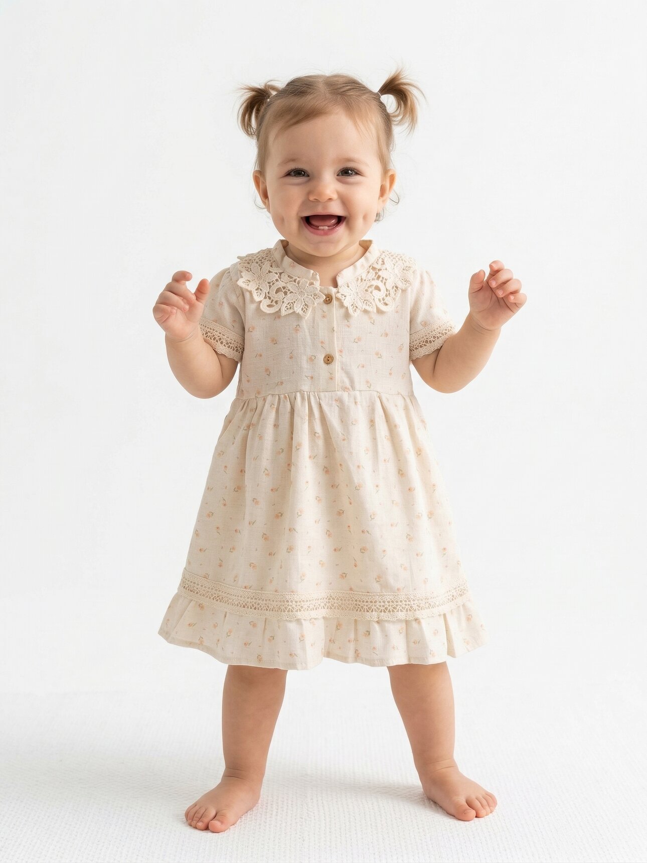 Pamuklu Keten Güpür Etekli Ayıcık Aksesuarlı Kız Bebek Elbise