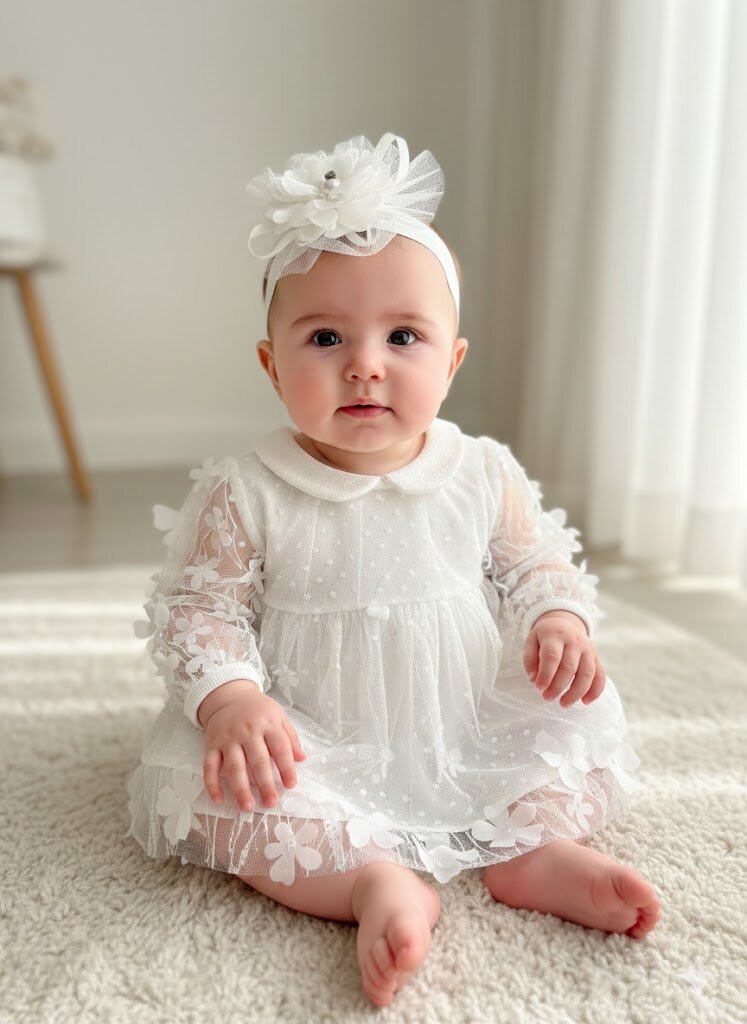 Pamuklu Çiçek Nakışlı Bandanalı Kız Bebek Elbise